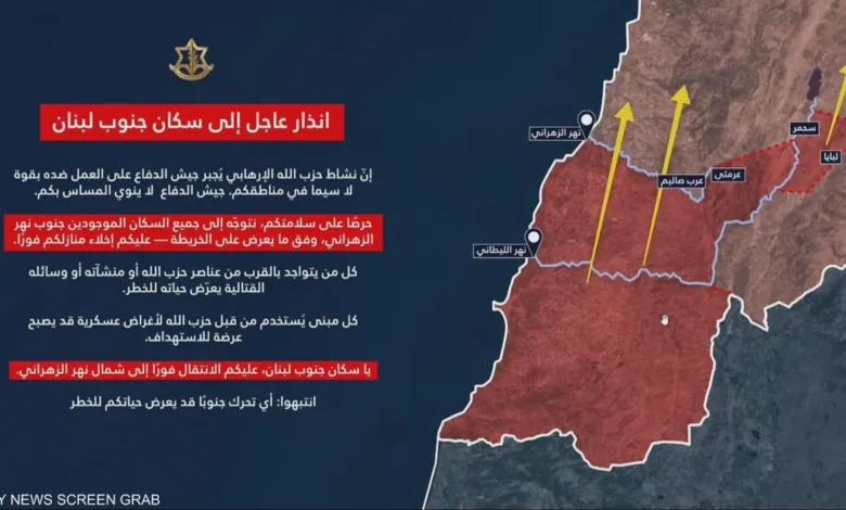 إسرائيل تنذر سكان جنوب نهر الزهراني في لبنان بالإخلاء الفوري